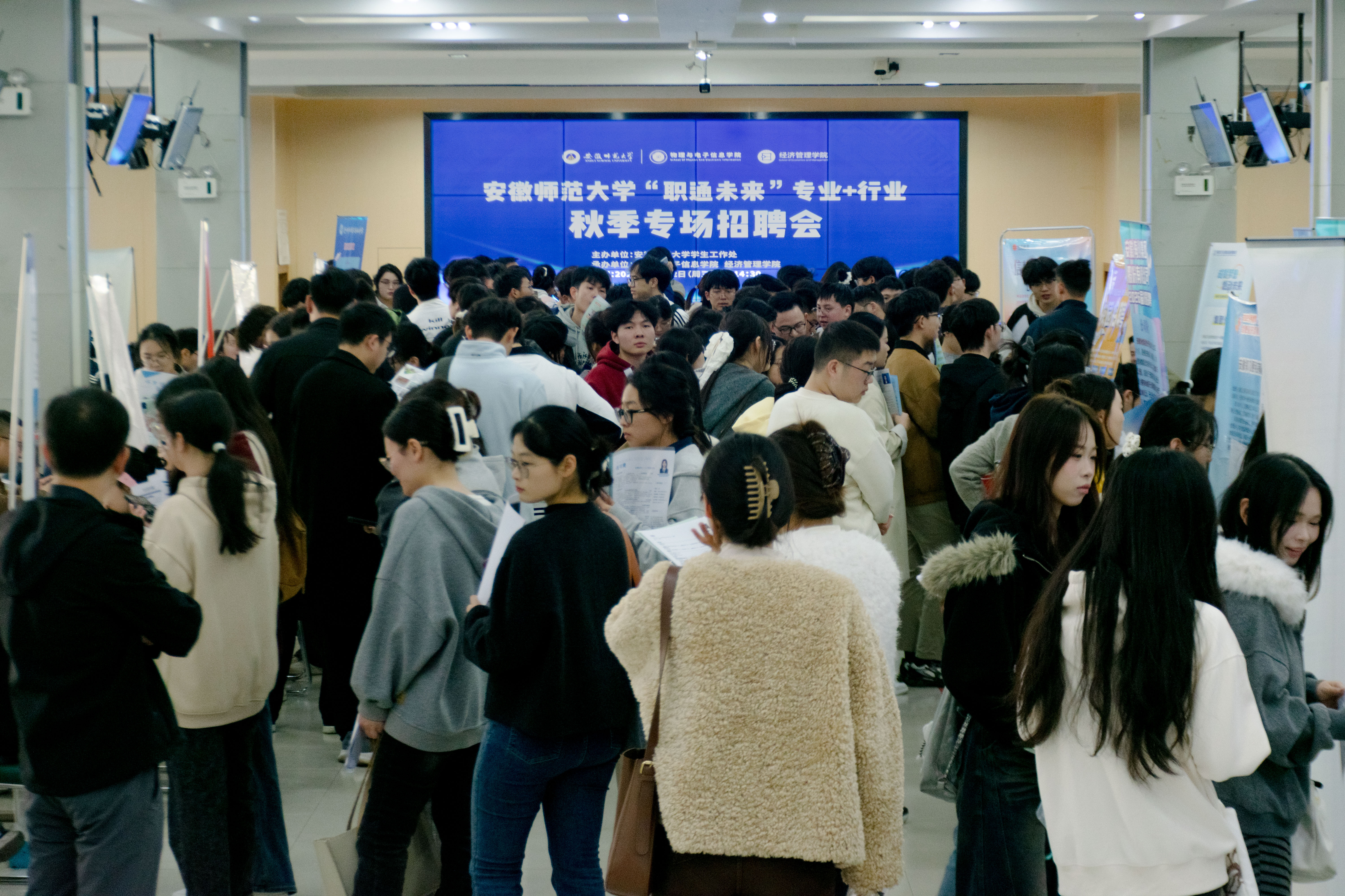 在大学生活动中心招聘大厅成功举办2026届毕业生“职通未来”专业+行业秋季专场招聘会。本次招聘会共吸引近30家用人单位参加,涵盖教师教育、电子信息、智能制造、金融管理等多个行业领域,提供就业岗位600余个。