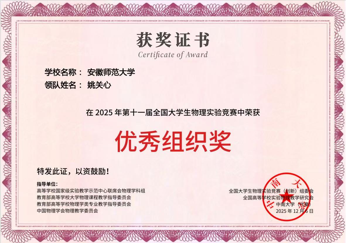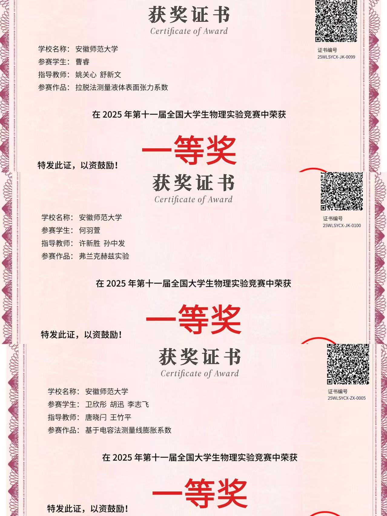 精心组织多轮集训,参赛团队师生全力打磨作品。经过校赛初审、国赛线上评审等环节的重重考验,最终,讲课类项目《拉脱法测量液体表面张力系数》《弗兰克赫兹实验》和自选类《基于电容法测量线膨胀系数》三个项目荣获全国一等奖。此外,命题类《光影密码:X射线如何“看见”晶体里的原子?》《基于U-Net模型的双光栅Lau效应波长测量系统》两个项目获得全国二等奖。