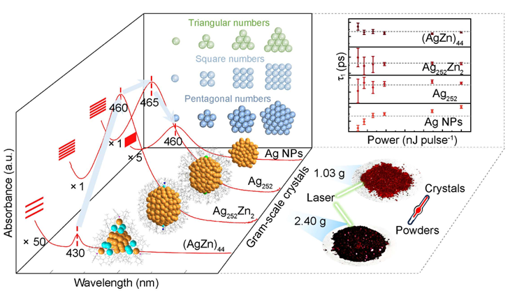 合肥物质科学研究院固体物理研究所伍志鲲研究员与庄胜利研究员团队,利用即时生成的银纳米团簇的“反伽伐尼还原”特性还原共存的锌离子,通过合金化增强了银纳米团簇的稳定性,实现了含1796个原子的银-锌纳米团簇(Ag252Zn2)的克级制备,单晶质量达2.40克,产率较已有大尺寸同类材料单晶产量记录提升了两个数量级。在此基础上,团队进一步开发了类似“原子手术”的精准去合金化技术,在不破坏纳米粒子框架结构的前提下,精准移除2个锌原子,成功获得了1.03克具有精确五重孪晶面心立方结构的纯银纳米团簇晶体(Ag252)。研究发现,尽管这两个团簇具有较大的尺寸,并且在溶液里显示了类等离子体吸收,但超快光谱和电子顺磁共振分析表明它们仍处于分子态,尚未进入金属态,说明超快动力学相对于稳态吸收光谱用于判断金属纳米粒子金属性更为可靠。此外,得益于晶体的大量合成,在本工作中还观察到结晶诱导的光热转换增强以及尺寸相关的吸收系数变化。