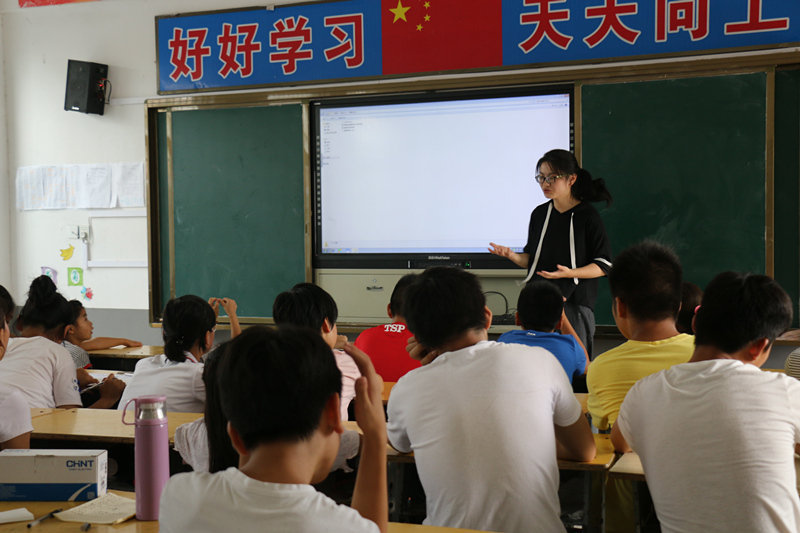赴安徽颖上鲁口镇中心学校团队为期7天支教活动正在进行中。7月27日,支教第三天。上午八点准时上课,队员们给孩子们上了朗诵课。大多数孩子还分不清翘舌音和平舌音,也无法通过语调的变化表达文章的感情。队员们很认真地跟孩子们讲解着,孩子们的眉头也逐渐舒展开,教室里的朗读声更加和谐。十点,朗读课下课休息十五分钟后,大家开始了第一节体育课。清晨的大雨给小镇送来久违的一阵清凉,孩子们迫不及待地跑到操场上,拉着队员们玩起游戏。第三天,队员们已经和这群可爱的孩子们打成一遍,孩子们眼中也已没有刚开始时的拘束和羞涩。下午三点,孩子们开始上课。下午的课程是物理和地理,主要目的是课后拓展,开阔孩子们的眼界。课堂上,同学们积极地举手回答问题,对从未涉及过的话题充满了好奇。