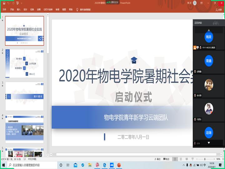 8月1日晚七点,团队在腾讯会议线上平台进行了第一次线上集体会议,主要内容为在活动中照片的采集要求,以及新闻稿与读后感的小培训,最后细致确定了团队分工,并强调了安全问题,团队成员每日须向安全员报备健康状况,再由安全员收集汇报色情网站