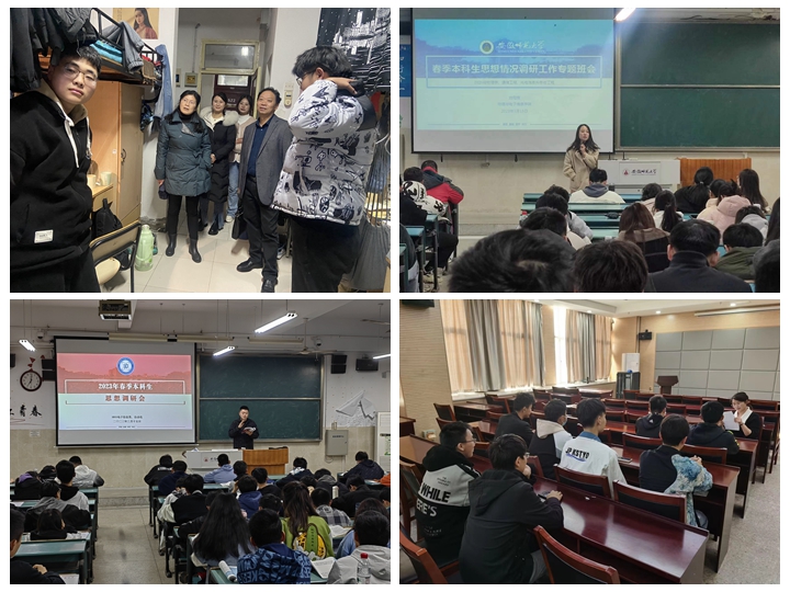 、学生组织、班级等多渠道调研掌握学生思想情况,通过“五特”学生跟进式服务、教师深入课堂听课、辅导员实施每周“四进”工作制度、主题班会、一站式学生宿舍社区楼、层长周例会、寝室民主生活会、问卷调查、谈心谈话等多种形式深入了解学生思想、学习和生活状况,通过开展“院领导接访服务日”“教授面对面”“四联系”“学海导航”等特色活动,广泛听取学生意见建议,精准解决诉求,不断提升教育教学管理和服务水平,为学生创造优良的成长成才环境。